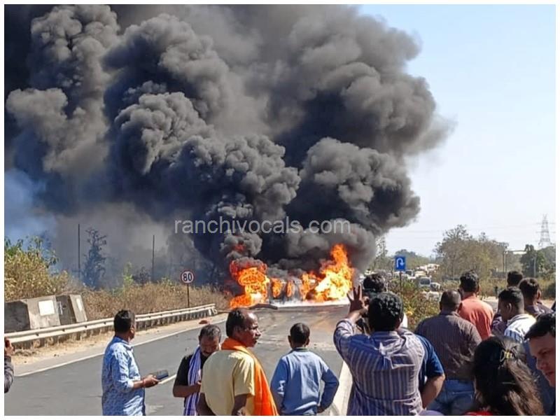 रांची-टाटा रोड पर डीजल टैंकर पलटा, भीषण आग से टैंकर जलकर राख