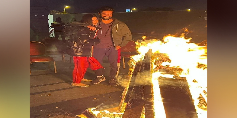 लाल सूट सलवार में अपने पति विक्की कौशल के साथ लोहड़ी मानते नज...